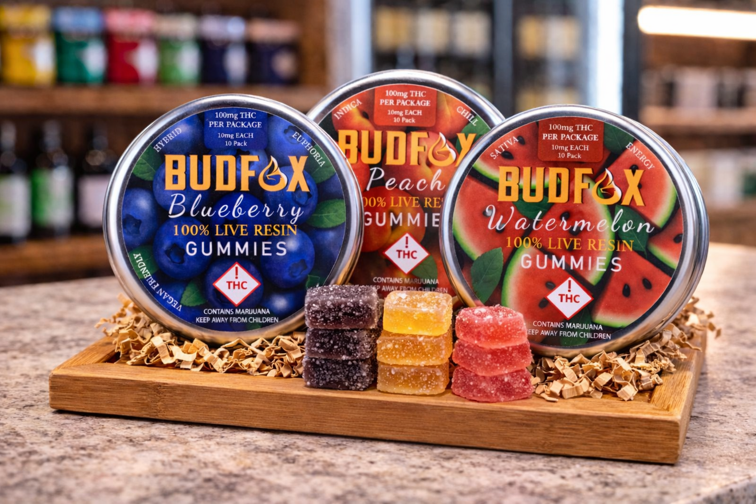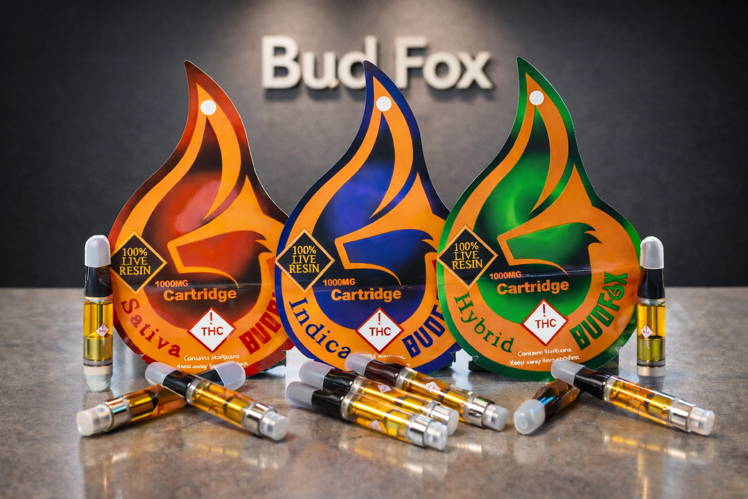 We offer a diverse lineup of high-performance products crafted through our vertically integrated cultivation and extraction process. Our 100% Live Resin lineup includes 1G cartridges, rechargeable 1G disposables, live resin sugar, live resin badder, live resin gummies, dry sugar, and bulk Grade-A flower — all produced with a commitment to quality, consistency, and affordability. Every Bud Fox product is hand-crafted from premium harvests within our state-of-the-art cultivation and manufacturing facility in Aurora.